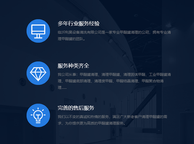 臨沂利昊設備清洗有限公司是一家從事清理甲醛罐、溶解聚合甲醛結晶、清理反應釜的現代化公司。清理甲醛罐的同時,減少對環境的影響。我們為客戶提供定制化的甲醛罐清洗解決方案... ...